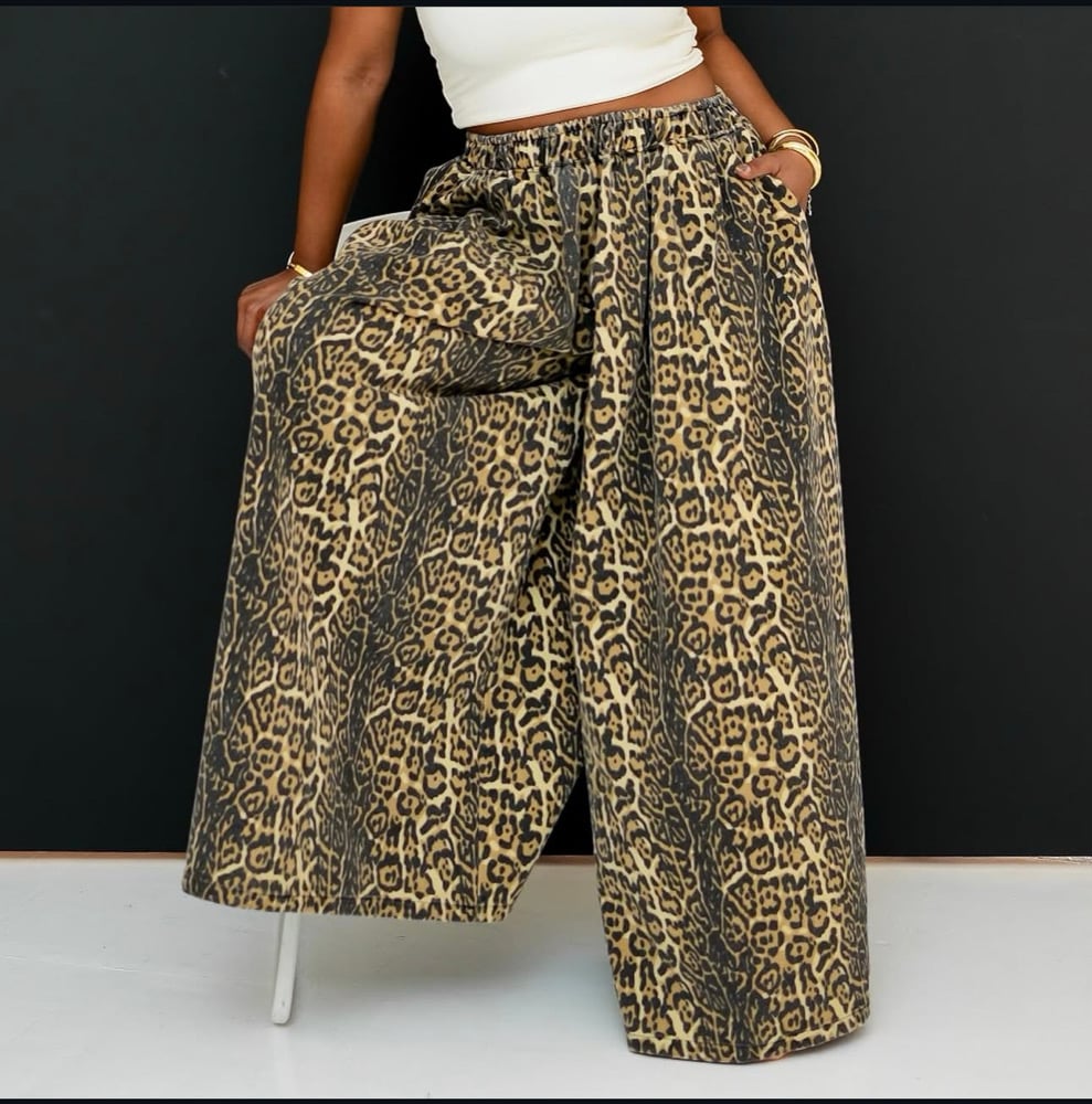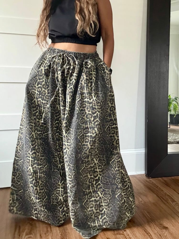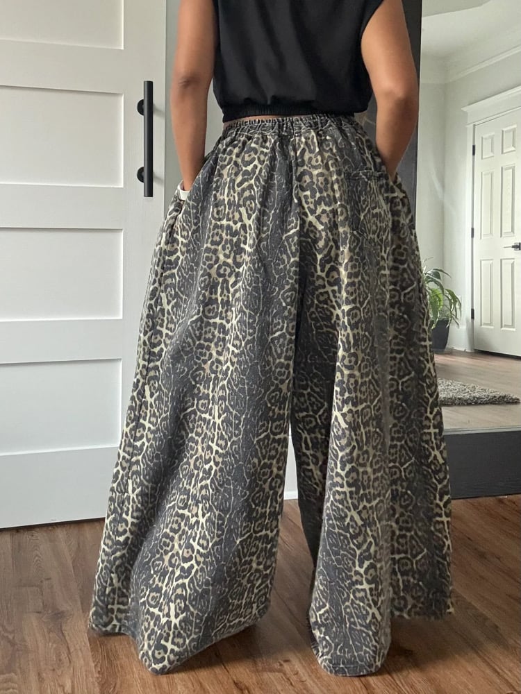 Leopard print light weight wide leg jeans with pockets; runs big.
