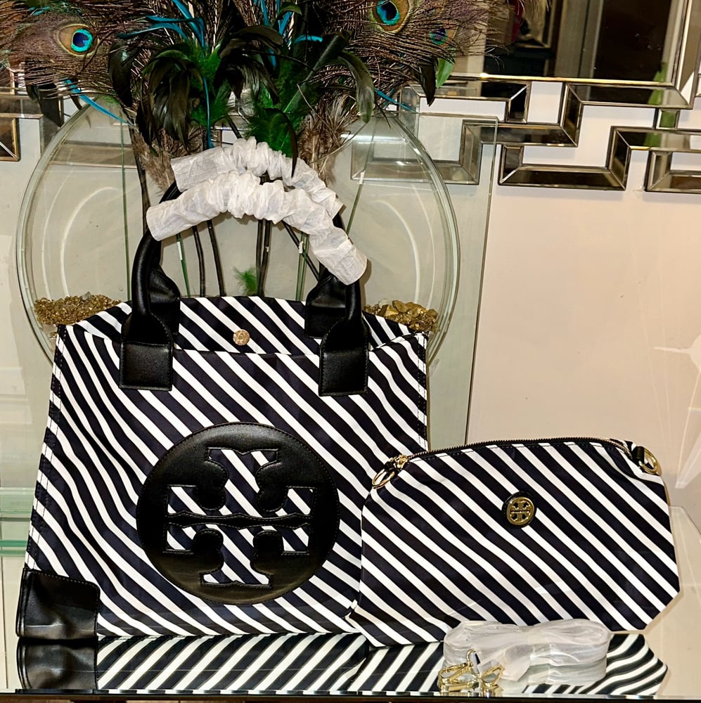 Black/white tote back with smaller pouch that can be used as pouch or crossbody. Includes dust bag and paperwork.
